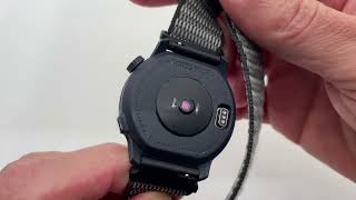 Данная модель представлена в черном цвете с нейлоновым ремешком. Помимо часов в комплект входит кабель для зарядки и синхронизации.